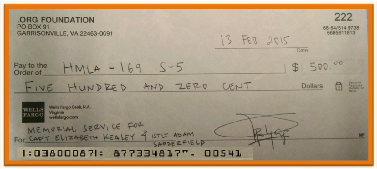 Through generous friends and supporters, .Org Foundation raised and donated $500 in support of Marine Light Attack Helicopter Squadron 169 (HMLA-169) memorial service held on February 20th, 2015 in honor of two fallen Marines: Major Elizabeth R. Kealey and Captain Adam C. Satterfield. We coordinated our donation through HMLA-169’s Family Readiness Officer, Mrs. McKenzie Apodaca. The names of our generous donors will be included in our 2015 Annual Report.
